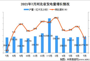 中商情报网讯:据中商产业研究院数据库显示,2021年7月河北省发电量274.6亿千瓦小时,同比上升3.7%。 数据来源:中商产业研究院数据库 2021年7月河北省发电量增长情况 ...【详情】