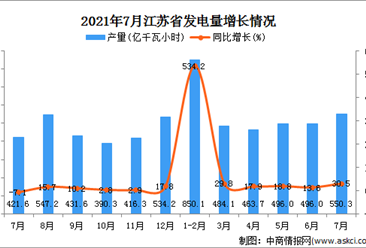 中商情报网讯:据中商产业研究院数据库显示,2021年7月江苏省发电量550.3亿千瓦小时,同比上升30.5%。 数据来源:中商产业研究院数据库 2021年7月江苏省发电量增长情况 ...【详情】