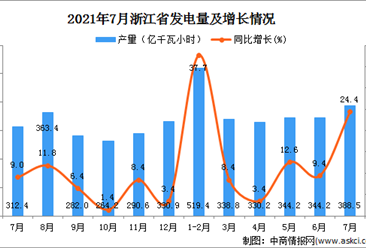 中商情报网讯:据中商产业研究院数据库显示,2021年7月浙江省发电量388.5亿千瓦小时,同比增长24.4%。 数据来源:中商产业研究院数据库 2021年7月浙江省发电量情况 数...【详情】