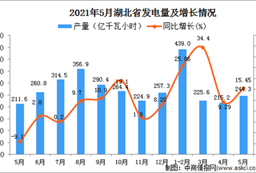 中商情报网讯:据中商产业研究院数据库显示,2021年5月湖北省发电量为244.3亿千瓦小时,同比增长15.45%。 数据来源:中商产业研究院数据库 2021年5月湖北省发电量增长情...【详情】
