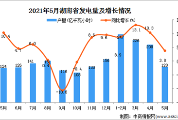 中商情报网讯:据中商产业研究院数据库显示,2021年5月湖南省发电量产量为128亿千瓦小时,同比增长3.8%。 数据来源:中商产业研究院数据库 2021年5月湖南省发电量增长情...【详情】