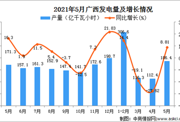 中商情报网讯:据中商产业研究院数据库显示,2021年5月广西发电量产量为186.4亿千瓦小时,同比增长8.81%。 数据来源:中商产业研究院数据库 2021年5月广西发电量增长情况...【详情】