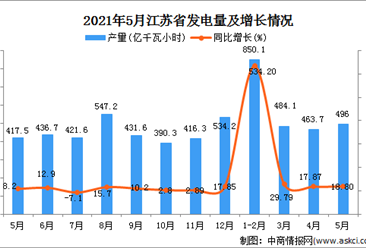 中商情报网讯:据中商产业研究院数据库显示,2021年5月江苏省发电量为496亿千瓦小时,同比增长18.8%。 数据来源:中商产业研究院数据库 2021年5月江苏省发电量增长情况 ...【详情】