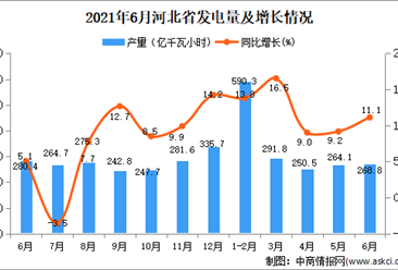 中商情报网讯:据中商产业研究院数据库显示,2021年6月河北省发电量为268.8亿千瓦小时,同比上升11.1%。 数据来源:中商产业研究院数据库 2021年6月河北省发电量增长情况...【详情】