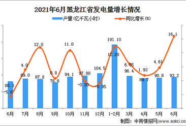 中商情报网讯:据中商产业研究院数据库显示,2021年6月黑龙江省发电量为93.2亿千瓦小时,同比上升16.1%。 数据来源:中商产业研究院数据库 2021年6月黑龙江省发电量增长...【详情】