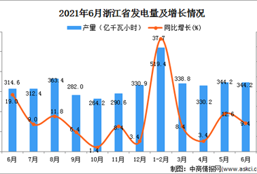 中商情报网讯:据中商产业研究院数据库显示,2021年6月浙江省发电量为344.2亿千瓦小时,同比上升9.4%。 数据来源:中商产业研究院数据库 2021年6月浙江省发电量增长情况 ...【详情】