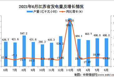中商情报网讯:据中商产业研究院数据库显示,2021年6月江苏省发电量为496亿千瓦小时,同比上升13.58%。 数据来源:中商产业研究院数据库 2021年6月江苏省发电量增长情况 ...【详情】
