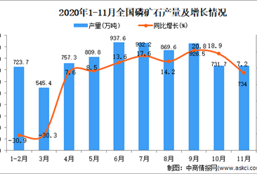中商情报网讯:据中商产业研究院数据库显示,2020年11月全国磷矿石产量为734万吨,同比增长7.2%。2020年1-11月全国磷矿石产量为7939.2万吨,同比增长1.1%。 数据来源:...【详情】