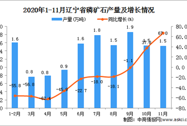 中商情报网讯:据中商产业研究院数据库显示,2020年11月辽宁省磷矿石产量为1.5万吨,同比增长67%。 数据来源:中商产业研究院数据库 2020年11月辽宁省磷矿石产量增长情...【详情】