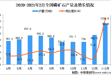 中商情报网讯:据中商产业研究院数据库显示,2021年1-2月全国磷矿石产量为1333.8万吨,同比增长82.6%。 数据来源:中商产业研究院数据库 2021年1-2月全国磷矿石产量统计...【详情】