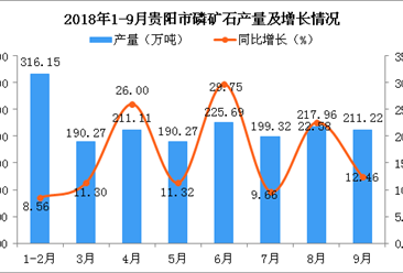 中商情报网讯:据中商产业研究院数据库显示,2018年3-9月贵阳市磷矿石产量波动幅度较大,2018年9月贵阳市磷矿石产量有所下降;2018年9月贵阳市磷矿石产量为211.22万吨,同...【详情】