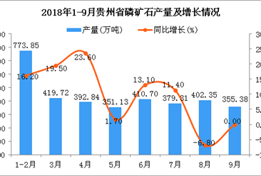 中商情报网讯:据中商产业研究院数据库显示,2018年6-9月贵州省磷矿石产量波动幅度较小,呈震荡下行;2018年9月贵州省磷矿石产量为355.38万吨,同比0%。2018年1-9月贵州省...【详情】