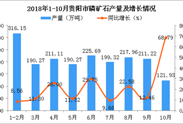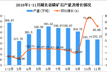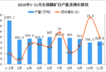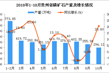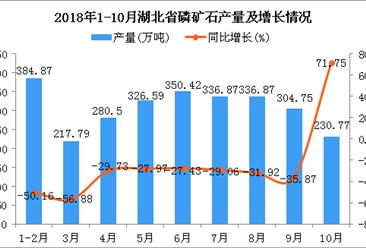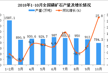 中商情报网讯:据中商产业研究院数据库显示,2018年5-6月全国磷矿石产量增长,2018年7-10月全国磷矿石产量大幅度下降;2018年10月全国磷矿石产量为784.3万吨,同比增长27....【详情】
