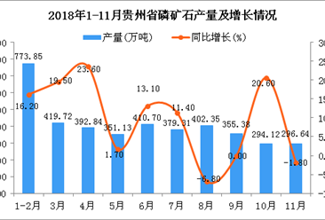 中商情报网讯:据中商产业研究院数据库显示,2018年1-3季度贵州省磷矿石产量呈下降趋势,下降幅度逐渐缩小;2018年11月贵州省磷矿石产量为296.64万吨,同比下降1.8%。2018...【详情】