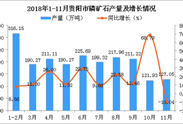 中商情报网讯:据中商产业研究院数据库显示,2018年1-3季度贵阳市磷矿石产量呈增长趋势,增长幅度有所减缓;2018年11月贵阳市磷矿石产量下降,产量为127.05万吨,同比下降...【详情】