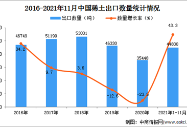中商情报网讯:据中商产业研究院数据库显示,2021年1-11月中国稀土出口量44830吨,同比增长43.3%。 数据来源:中商产业研究院数据库 从金额方面来看,2021年1-11月中国...【详情】