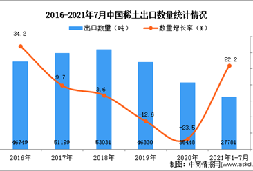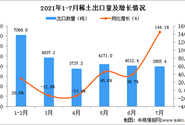 中商情报网讯:据中商产业研究院数据库显示,2021年1-7月中国稀土及其制品出口量60928吨,同比增长32.2%。 数据来源:中商产业研究院数据库 从金额方面来看,2021年1-7月...【详情】