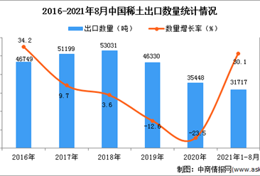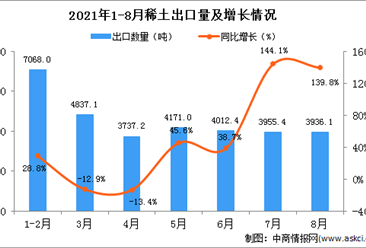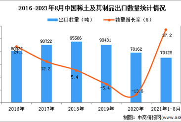 中商情报网讯:据中商产业研究院数据库显示,2021年1-8月中国稀土及其制品出口量70129吨,同比增长37.2%。 数据来源:中商产业研究院数据库 从金额方面来看,2021年1-8...【详情】