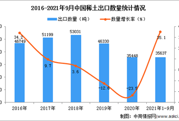 中商情报网讯:据中商产业研究院数据库显示,2021年1-9月中国稀土出口量35637吨,同比增长35.1%。 数据来源:中商产业研究院数据库 从金额方面来看,2021年1-9月中国稀...【详情】