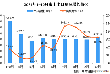 中商情报网讯:据中商产业研究院数据库显示,2021年10月中国稀土出口量4330.4吨,同比增长89.2%。 数据来源:中商产业研究院数据库 从金额方面来看,2021年10月中国稀土...【详情】