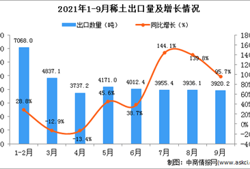中商情报网讯:据中商产业研究院数据库显示,2021年1-9月中国稀土及其制品出口量79496吨,同比增长40.2%。 数据来源:中商产业研究院数据库 从金额方面来看,2021年1-9月...【详情】
