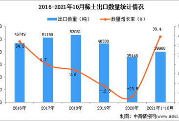 中商情报网讯:据中商产业研究院数据库显示,2021年1-10月中国稀土出口量39968吨,同比增长39.4%。 数据来源:中商产业研究院数据库 从金额方面来看,2021年1-10月中国...【详情】