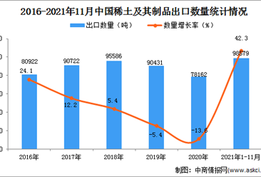 中商情报网讯:据中商产业研究院数据库显示,2021年1-11月中国稀土及其制品出口量98579吨,同比增长42.3%。 数据来源:中商产业研究院数据库 从金额方面来看,2021年1-1...【详情】