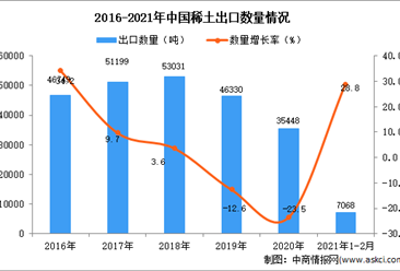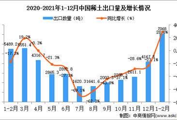 中商情报网讯:据中商产业研究院数据库显示,2021年1-2月中国稀土及其制品出口量为15701吨,同比增长42.2%。 数据来源:中商产业研究院数据库 从金额方面来看,2021年1-...【详情】