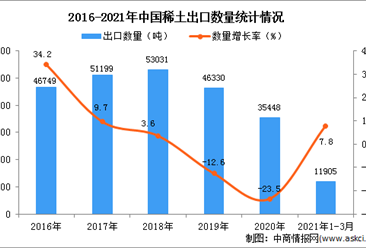 中商情报网讯:据中商产业研究院数据库显示,2021年1-3月中国稀土及其制品出口量24782万吨,同比增长23.3%。 数据来源:中商产业研究院数据库 从金额方面来看,2021年1-3...【详情】