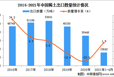 中商情报网讯:据中商产业研究院数据库显示,2021年1-4月中国稀土出口量15642万吨,同比增长1.9%。 数据来源:中商产业研究院数据库 从金额方面来看,2021年1-4月稀土出...【详情】