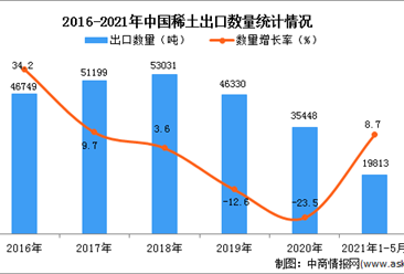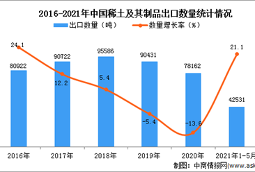 中商情报网讯:据中商产业研究院数据库显示,2021年1-5月中国稀土及其制品出口量42531吨,同比增长21.1%。 数据来源:中商产业研究院数据库 从金额方面来看,2021年1-5月...【详情】