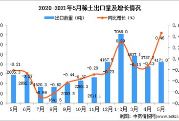 中商情报网讯:据中商产业研究院数据库显示,2021年5月中国稀土出口量4171吨,同比增长0.46%。 数据来源:中商产业研究院数据库 从金额方面来看,2021年5月中国稀土出口...【详情】