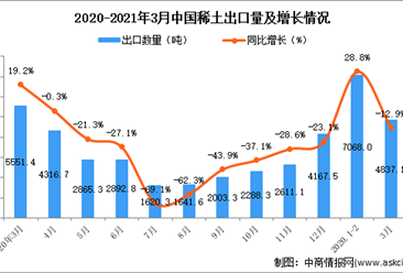 中商情报网讯:据中商产业研究院数据库显示,2021年1-3月中国稀土出口量4837.1吨,同比下降12.9%。 数据来源:中商产业研究院数据库 从金额方面来看,2021年1-3月中国稀...【详情】