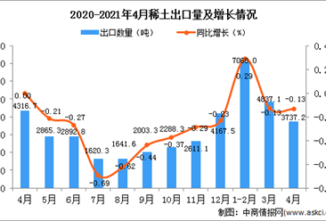 中商情报网讯:据中商产业研究院数据库显示,2021年1-4月中国稀土及其制品出口量33329万吨,同比增长16.3%。 数据来源:中商产业研究院数据库 从金额方面来看,2021年1-4...【详情】