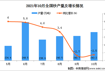 中商情报网讯:据中商产业研究院数据库显示,2021年10月全国纱产量243.2万吨,同比下降2.5%。 数据来源:中商产业研究院数据库 2021年10月全国纱产量统计 数据来源:...【详情】