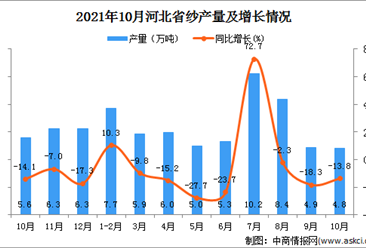 中商情报网讯:据中商产业研究院数据库显示,2021年10月河北省纱4.8万吨,同比下降13.8%。 数据来源:中商产业研究院数据库 2021年10月河北省纱增长情况 数据来源:中...【详情】