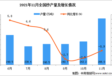 中商情报网讯:据中商产业研究院数据库显示,2021年11月全国纱产量266万吨,同比下降0.9%。 数据来源:中商产业研究院数据库 2021年11月全国纱产量统计 数据来源:中...【详情】
