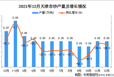 中商情报网讯:据中商产业研究院数据库显示,2021年天津纱每月产量波动小,12月与上月产量持平,全年同比下降。 2021年12月天津纱产量为0.05万吨,同比下降28.6%。2021年...【详情】