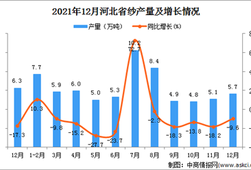 中商情报网讯:据中商产业研究院数据库显示,2021年12月河北纱产量较上月增长,全年产量同比下降。 2021年12月河北纱产量为5.7万吨,同比下降9.6%。2021年河北纱产量为60....【详情】