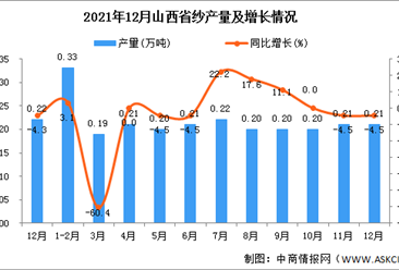 中商情报网讯:据中商产业研究院数据库显示,2021年12月山西省纱产量与上月持平,全年产量同比增长。 2021年12月山西省纱产量为0.21万吨,同比下降4.5%。2021年山西省纱产...【详情】