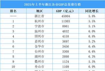 中商情报网讯:上半年,浙江经济运行稳中有进、向新向好。全省地区生产总值(GDP总量)45004亿元,按不变价格计算,同比增长5.8%。其中,杭州以11303亿元GDP总量位居榜首...【详情】