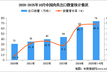 中商情报网讯:据中商产业研究院数据库显示,2024年中国肉类(包括杂碎)出口量63万吨,同比增长45.7%。最新数据显示,2025年1-10月中国肉类(包括杂碎)出口量74万吨,同...【详情】