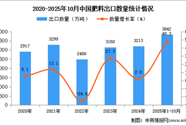 中商情报网讯:据中商产业研究院数据库显示,2025年10月中国肥料出口量505.7万吨,同比增长0.7%;1-10月中国肥料出口量3842万吨,同比增长48.3%。 数据来源:中商产业研...【详情】