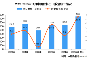 中商情报网讯:据中商产业研究院数据库显示,2025年11月中国肥料出口量444.1万吨,同比增长0.3%;1-11月中国肥料出口量4286万吨,同比增长46.4%。 数据来源:中商产业研...【详情】
