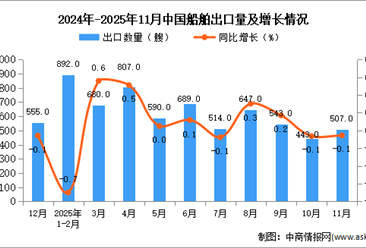 中商情报网讯:据中商产业研究院数据库显示,2025年11月中国船舶出口量507艘,同比下降0.1%;1-11月我国船舶累计出口量6159艘,同比增长17.8%。 数据来源:中商产业研究...【详情】