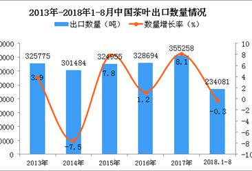 中商情报网讯:据中商产业研究院数据库显示,2014年-2017年中国茶叶出口量呈增长趋势,2017年中国茶叶出口量为355258吨,同比增长8.1%。2018年1-8月中国茶叶出口量为23408...【详情】