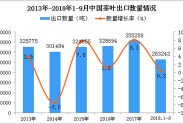 中商情报网讯:据中商产业研究院数据库显示,2014年-2017年中国茶叶出口量呈增长趋势,2017年中国茶叶出口量为355258吨,同比增长8.1%。2018年1-9月中国茶叶出口量为26324...【详情】