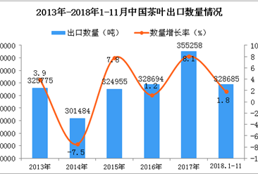 中商情报网讯:据中商产业研究院数据库显示,2014年-2017年中国茶叶出口量呈增长趋势,2017年中国茶叶出口量为355258吨,同比增长8.1%。2018年1-11月中国茶叶出口量为3286...【详情】
