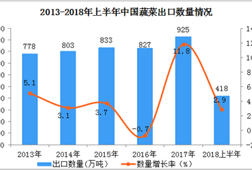 中商情报网讯:据中商产业研究院发布的《2018-2023年中国蔬菜行业市场前景及投资机会研究报告》数据统计显示,2018年6月中国出口蔬菜76万吨,同比下降20.2个百分点。1-6月...【详情】