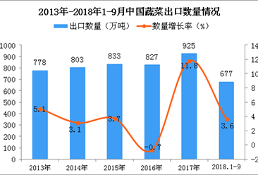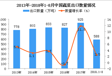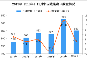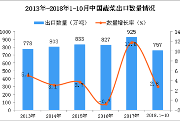 中商情报网讯:据中商产业研究院数据库显示,2013年-2015年中国蔬菜出口量呈小幅度增长,2017年中国蔬菜出口量大幅度增长;2017年中国蔬菜出口量为925万吨,同比增长11.8%...【详情】